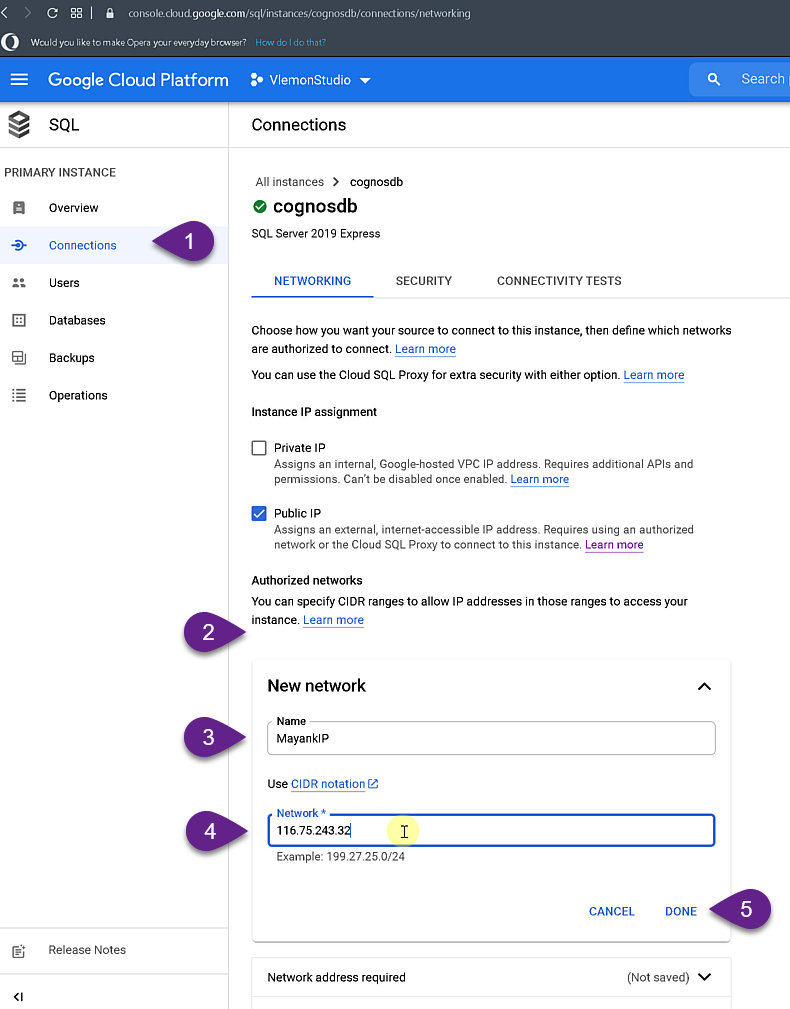 Without adding an IP address in the allow listing, we can’t connect to the Cloud SQL Server. To add an IP address, first, we need to click on the “Connections” and then click on the “ADD NETWORK” button. After that, we need to provide the name and IP address. Finally, click on the “Done” button to save the IP address. Once the saving is complete, we can access the Cloud SQL from the mentioned IP address.